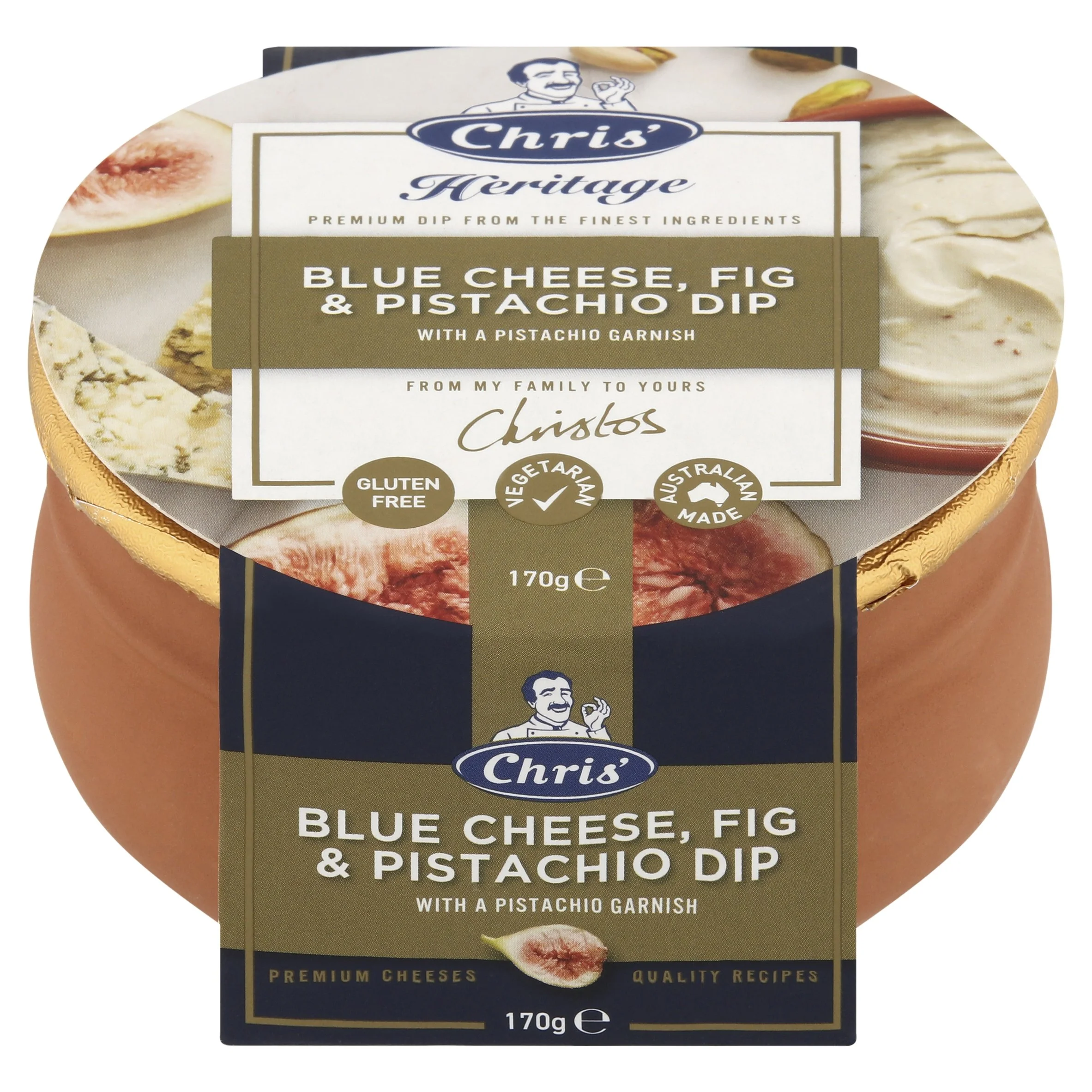 1/4 – 1/3 cup Chris’ Heritage Blue Cheese, Fig and Pistachio Dip, depending on size of toast